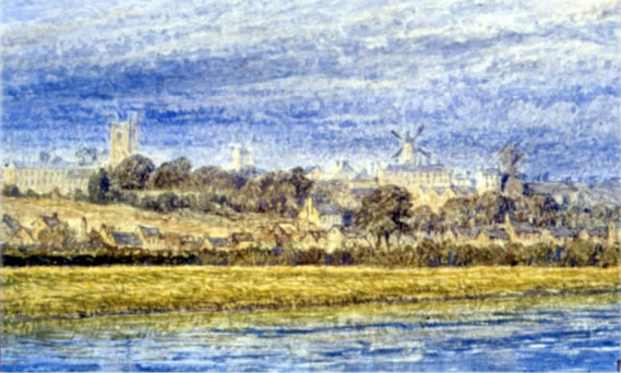 To the left is the tower of Sneinton parish church and to the right Green’s Mill.